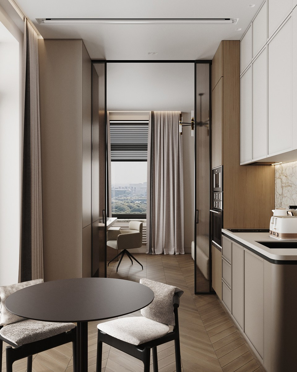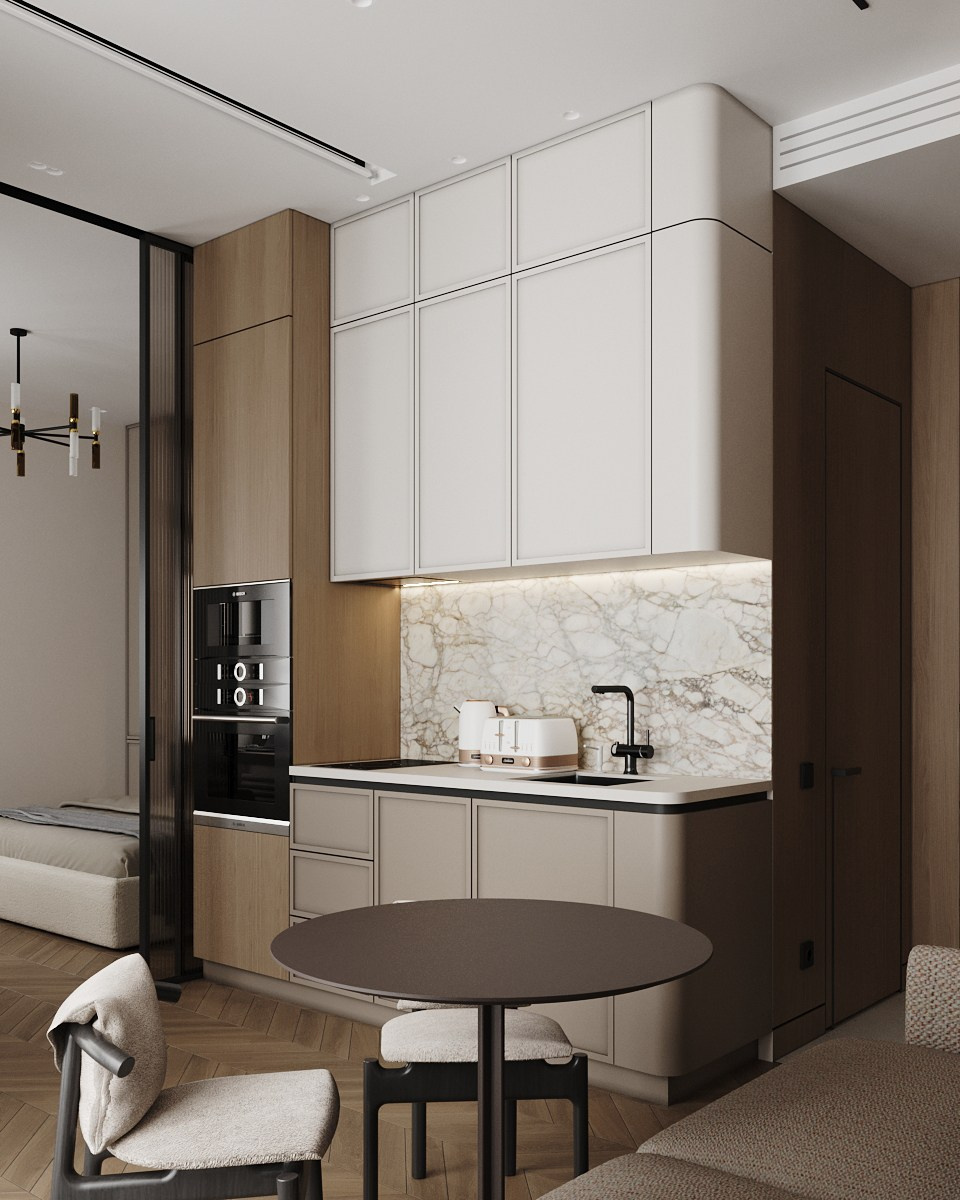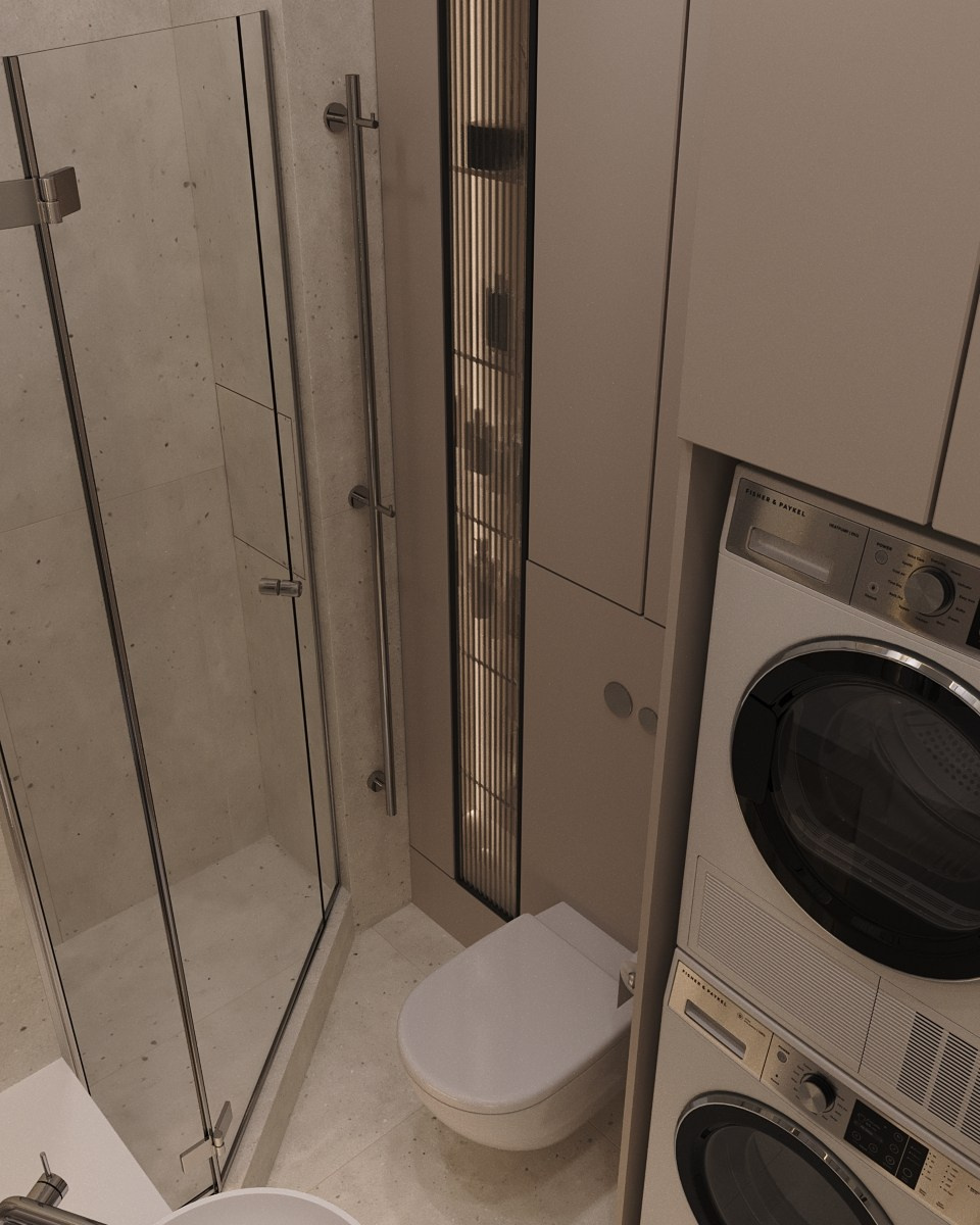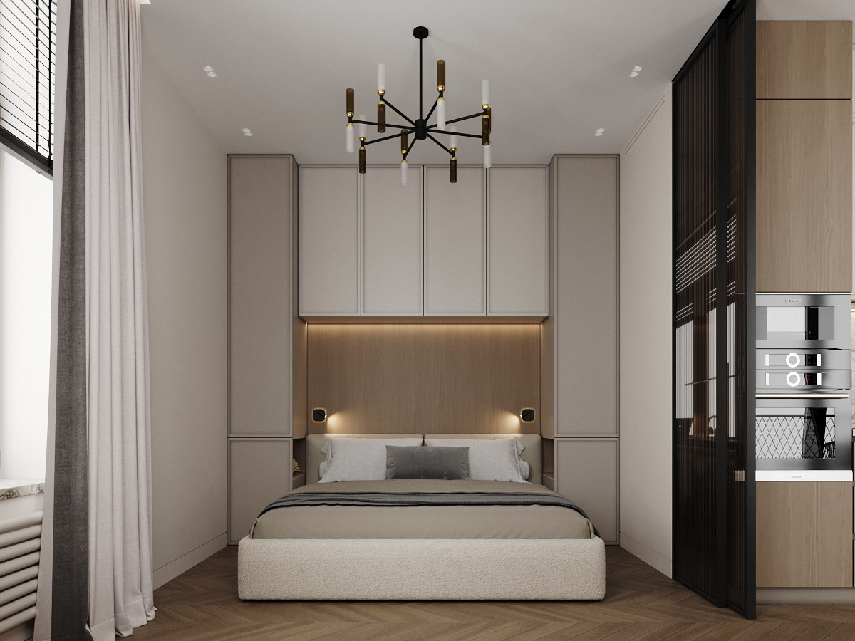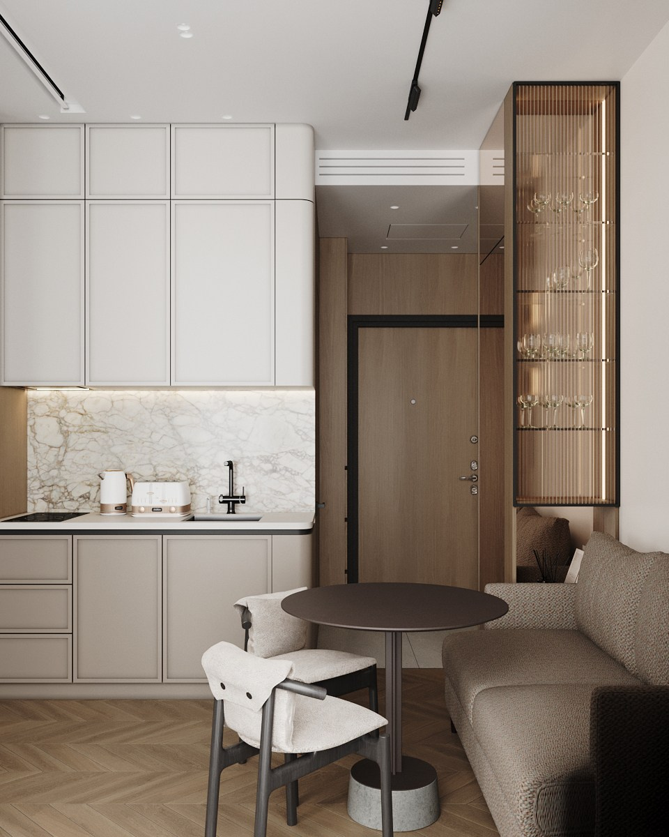 На небольшой площади удалось разместить всё для комфортного проживания: функциональная кухня-гостиная с домашним кинотеатром; изолированная спальня, отделенная стеклянными дверьми, с гардеробной системой и рабочим местом; полноценный санузел с системой хранения и постирочной зоной.
