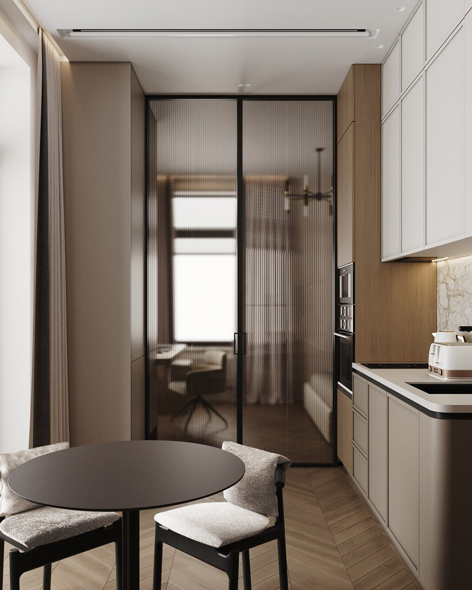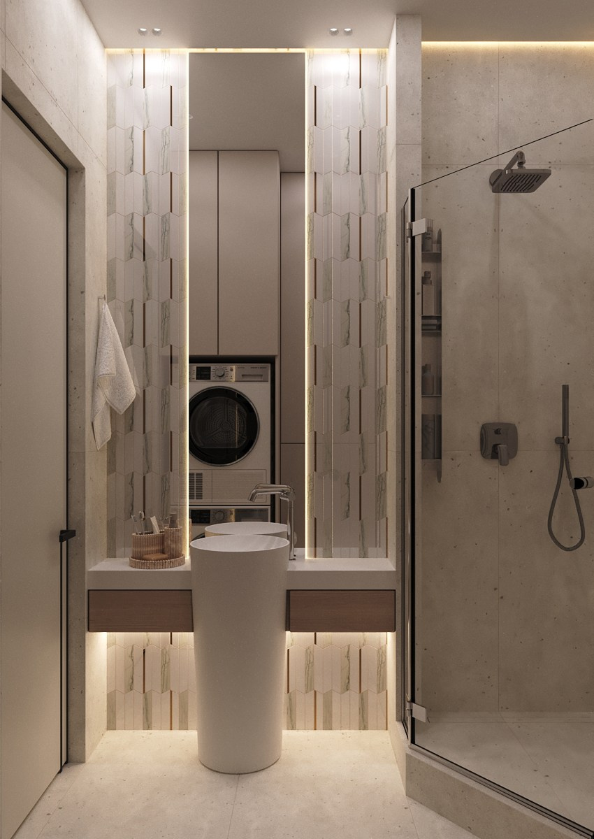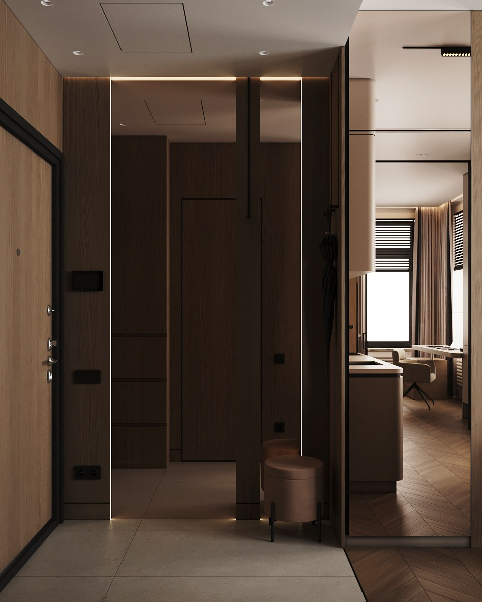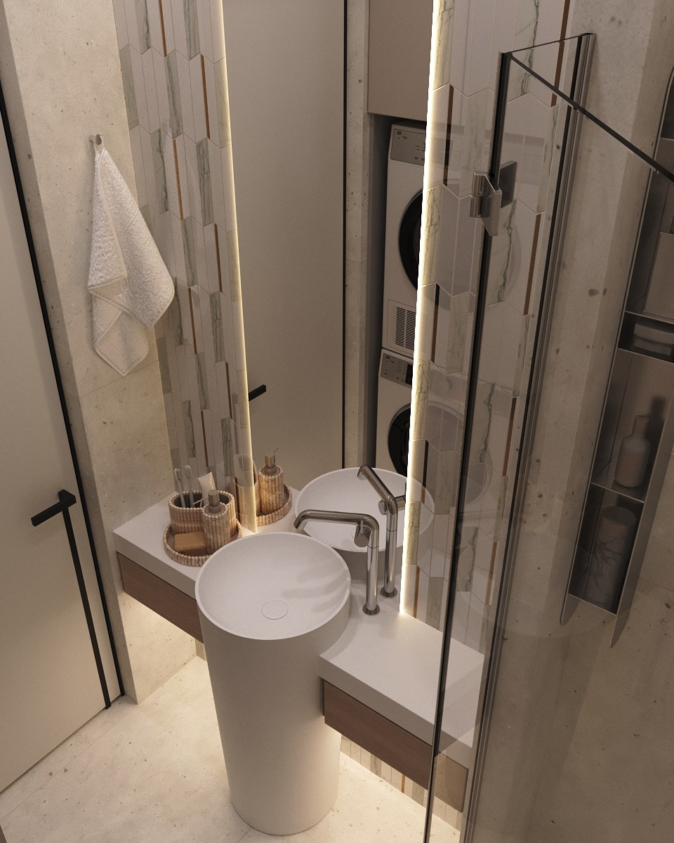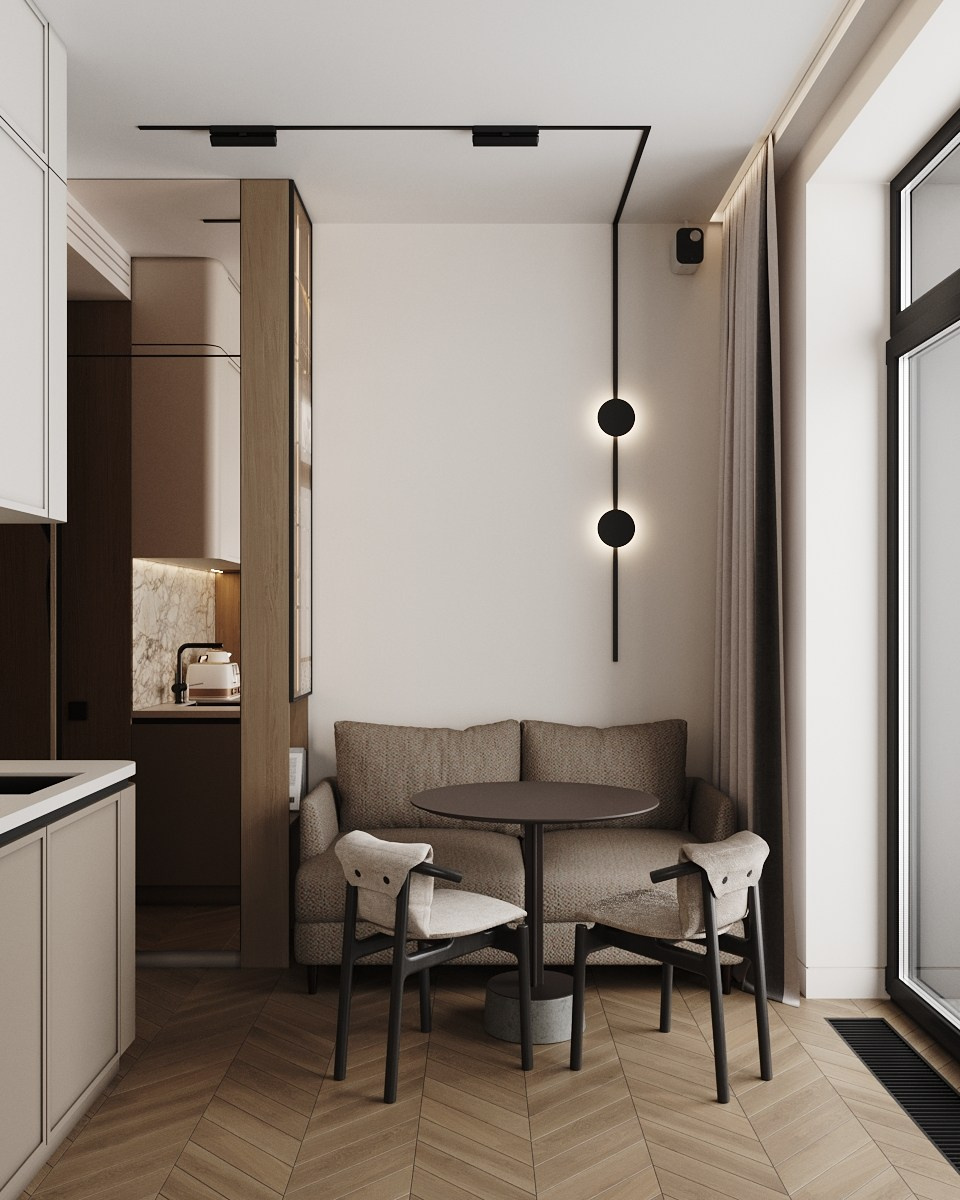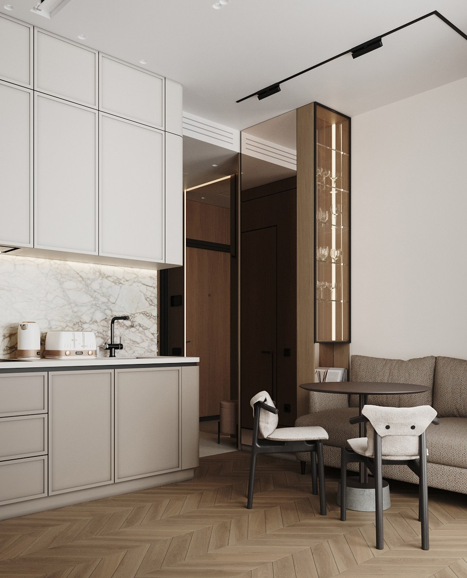 На небольшой площади удалось разместить всё для комфортного проживания: функциональная кухня-гостиная с домашним кинотеатром; изолированная спальня, отделенная стеклянными дверьми, с гардеробной системой и рабочим местом; полноценный санузел с системой хранения и постирочной зоной.