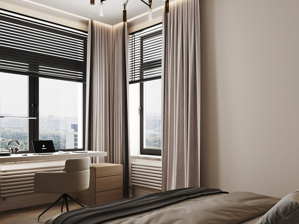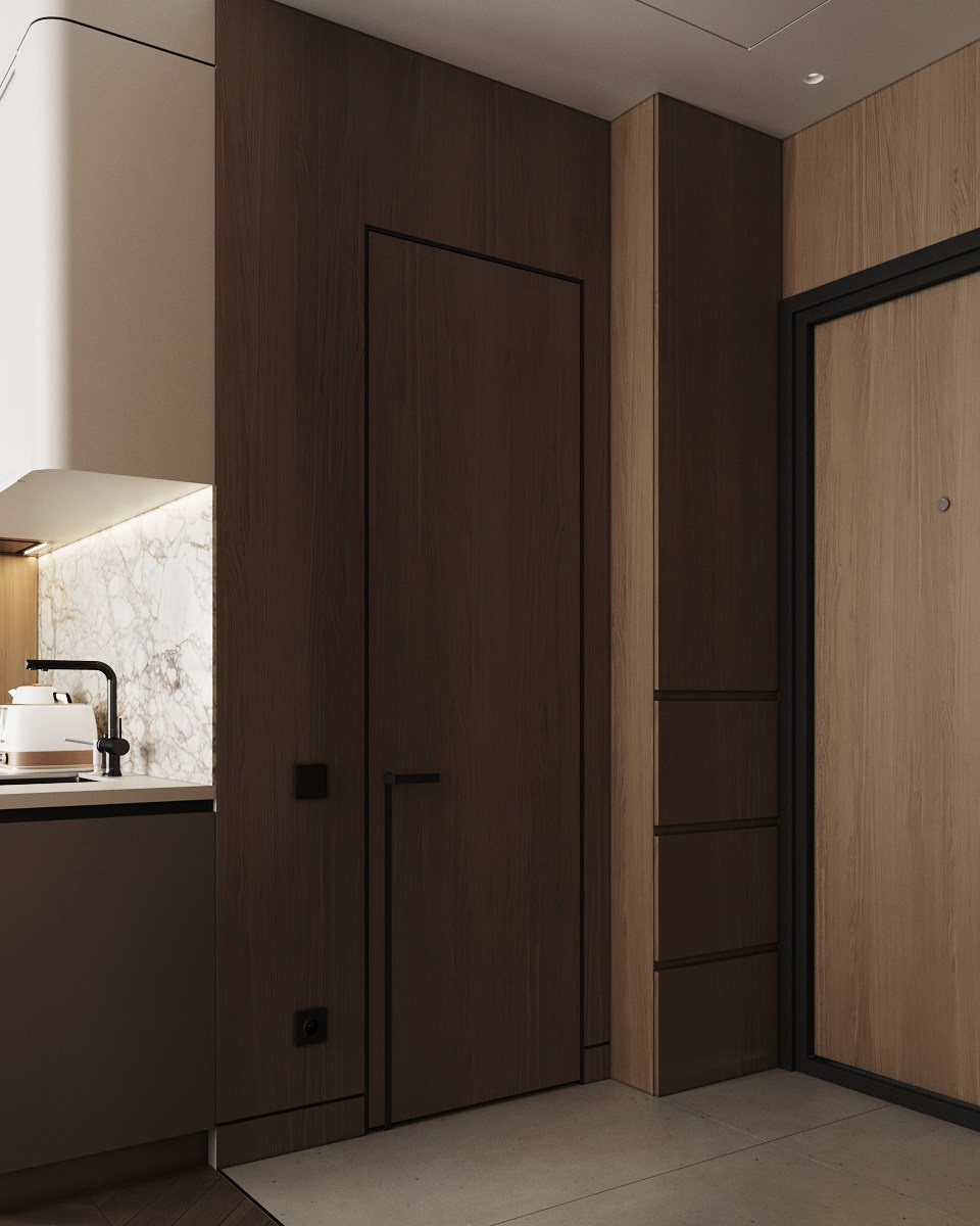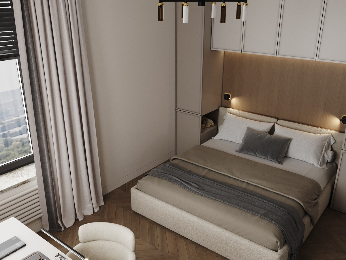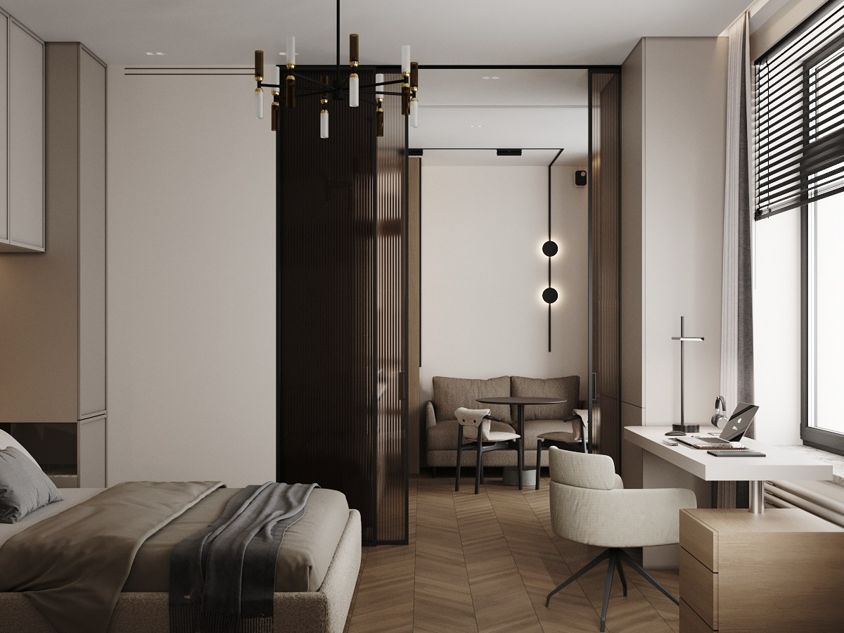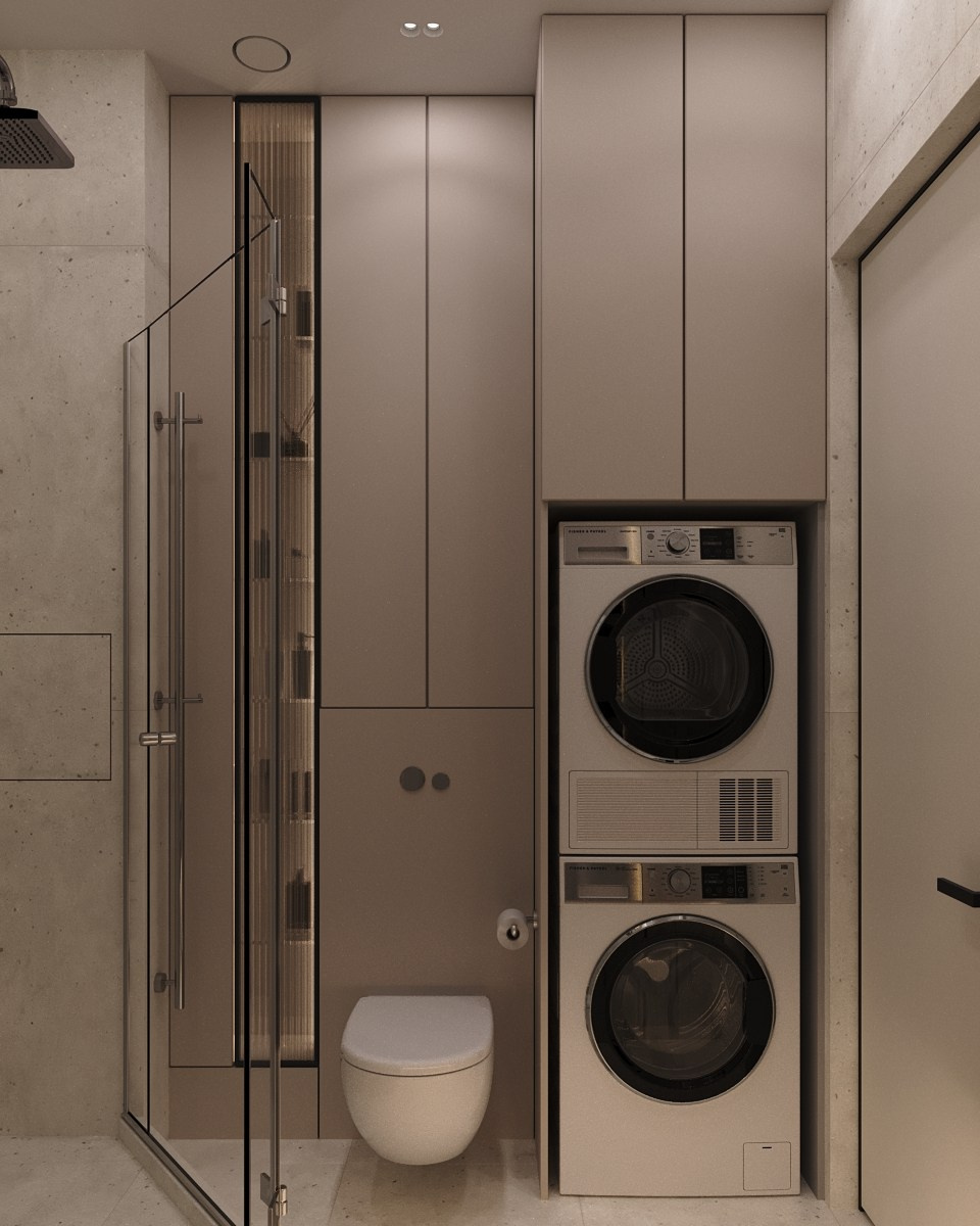 На небольшой площади удалось разместить всё для комфортного проживания: функциональная кухня-гостиная с домашним кинотеатром; изолированная спальня, отделенная стеклянными дверьми, с гардеробной системой и рабочим местом; полноценный санузел с системой хранения и постирочной зоной.