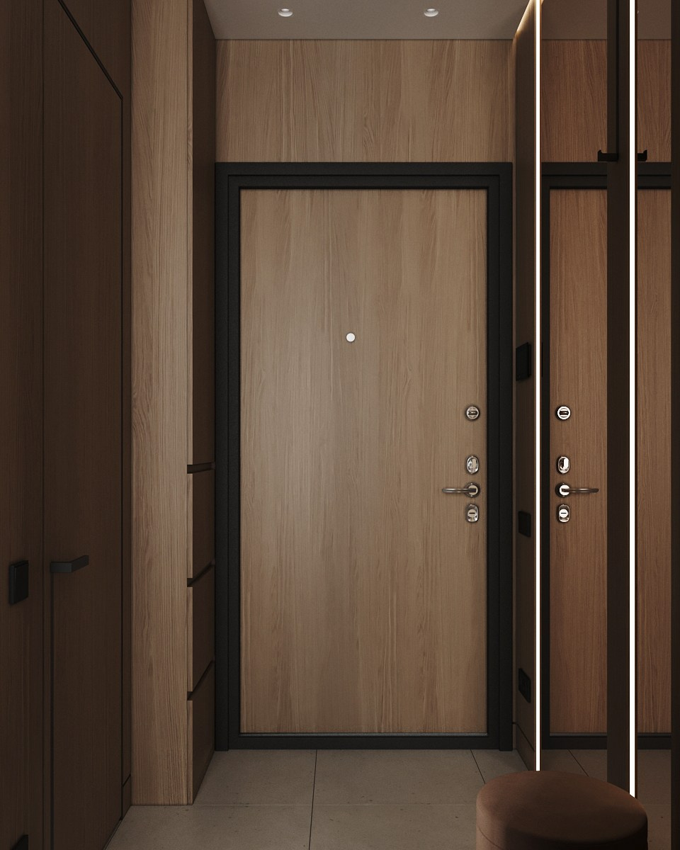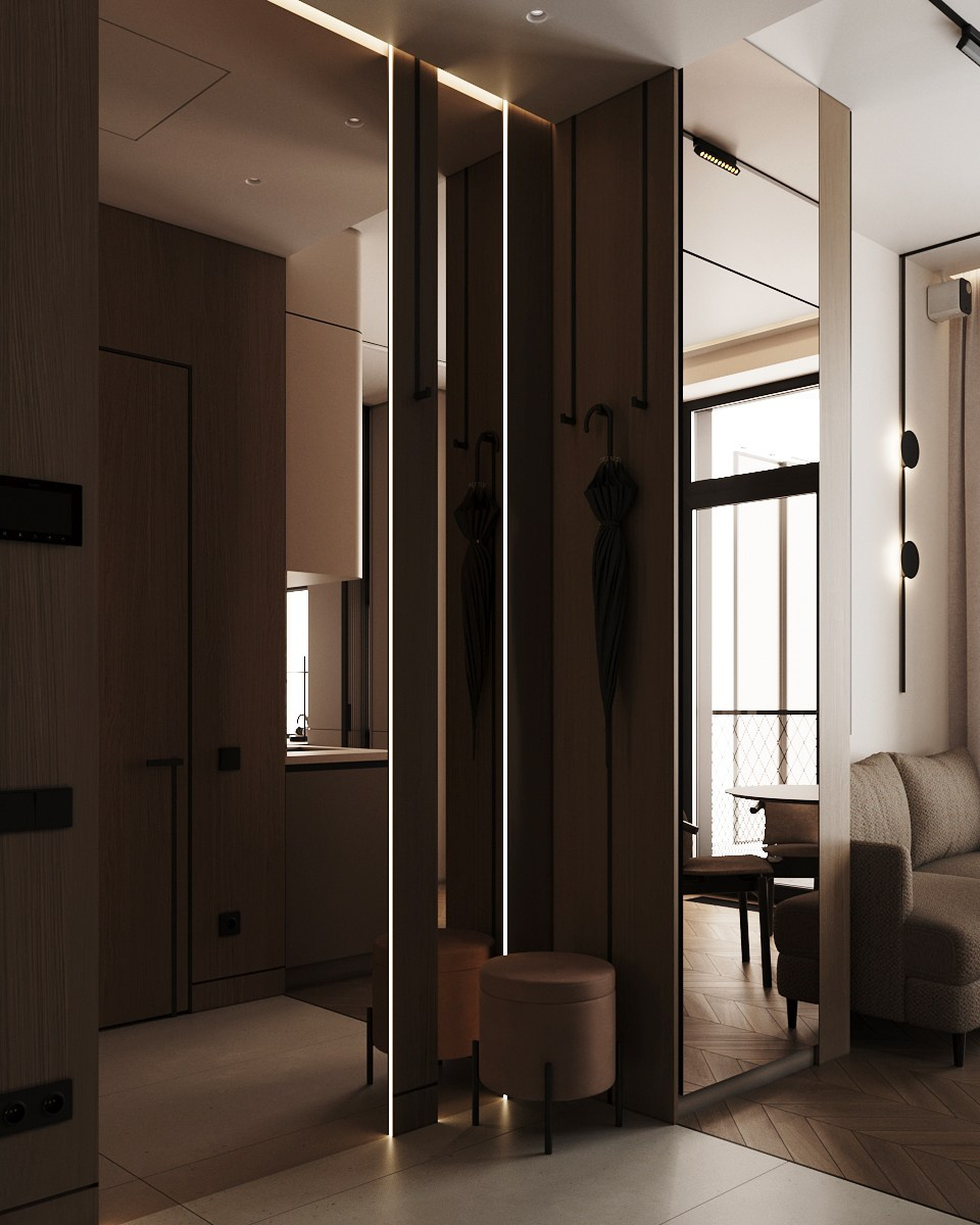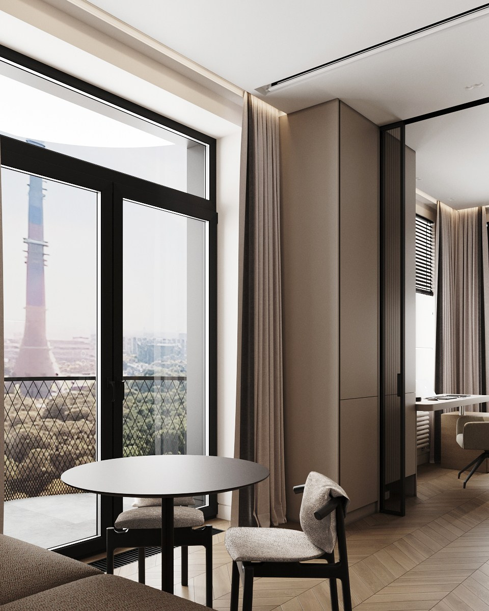 Квартира выполнена в современном минимализме с использованием дизайнерских предметов мебели российского производства.