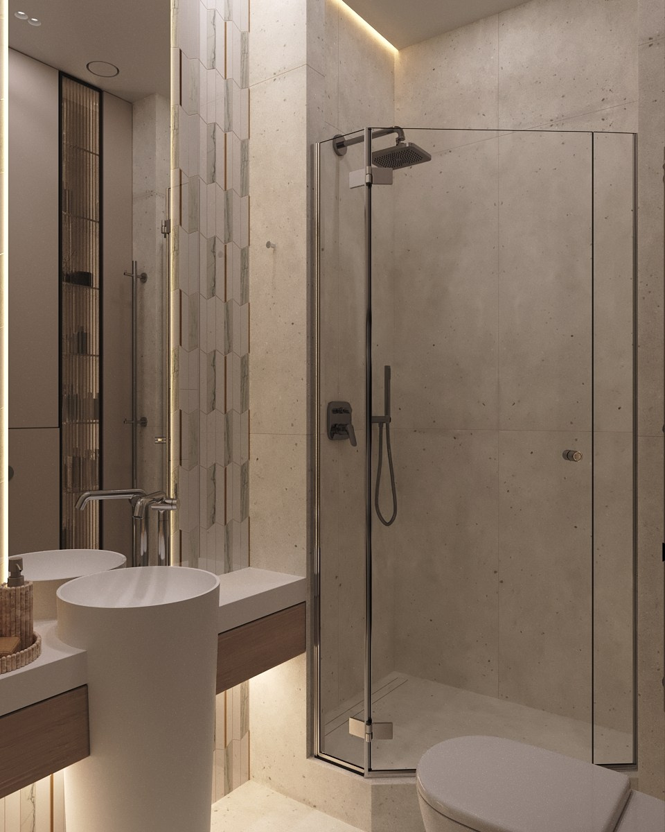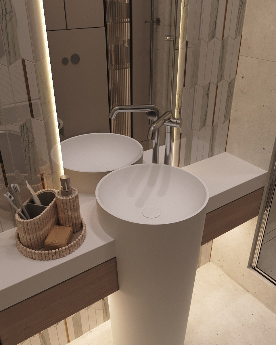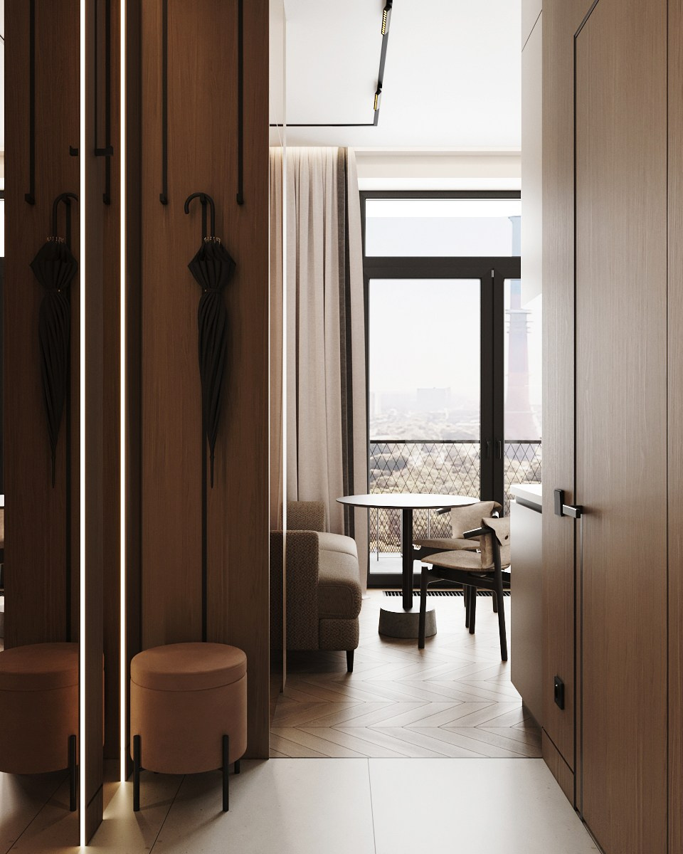 Квартира выполнена в современном минимализме с использованием дизайнерских предметов мебели российского производства.